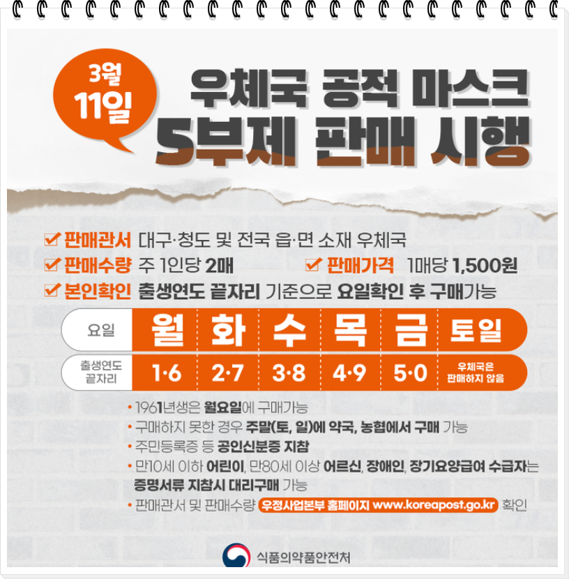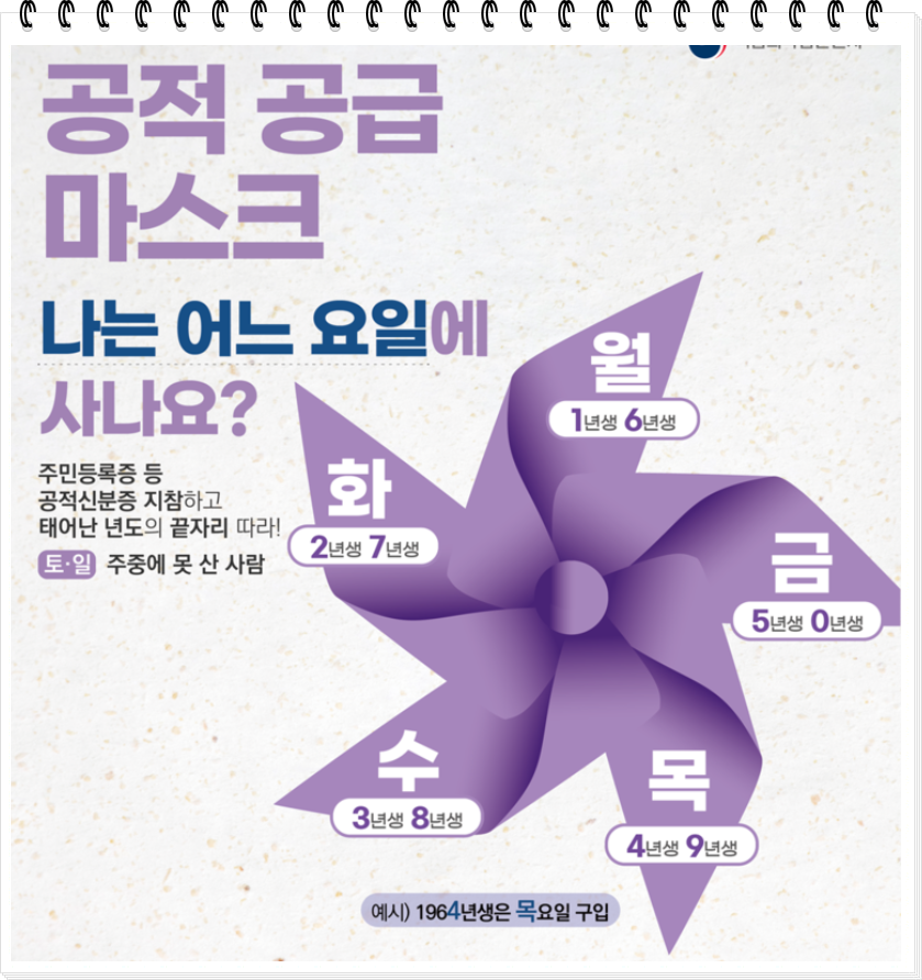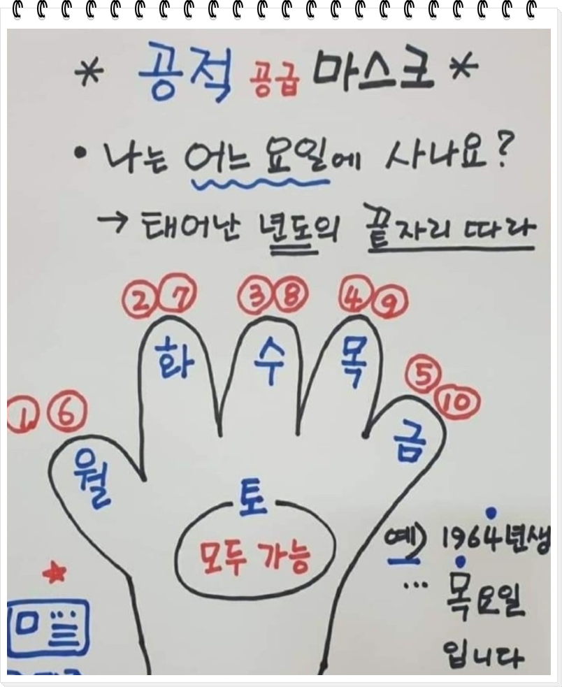 이렇게 센스있게 그림으로 그려주신분도 계십니다. 요거 보면 내가 언제 살 수 있는지 5부제를 확실히 이해하실수 있겠죠? 오늘은 목요일이니 주민번호 태어난 년도 끝자리가 4나9이신 분들이 구매가능합니다. 이걸 생년월일로 착각하시기도 하던데 반드시 기억하세요 연도가 중요하다는걸요 오늘은 1964년생이나 1979년생이 구매할 수 있답니다!!