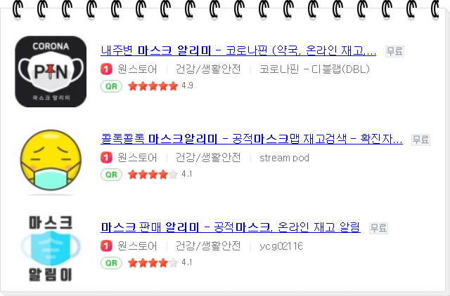 그럼 먼저 마스크알리미 앱이 어떤 것들이 있는지 알려드릴게요. 이번에 많은 앱들이 나왔는데요. 검색해보면 이런 앱들이 있니다.